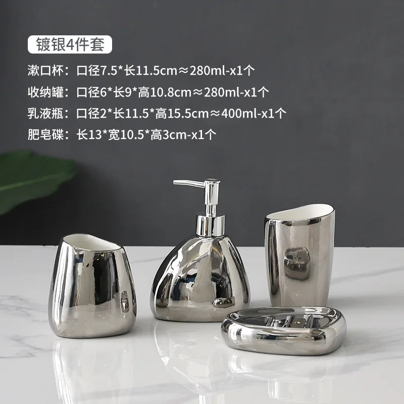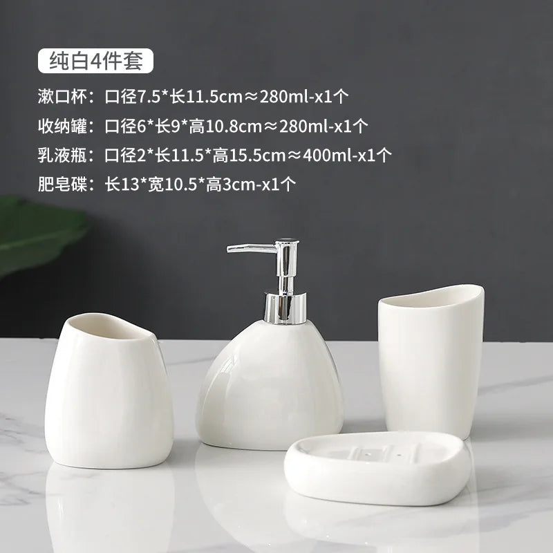 Elevate your bathroom decor with the Ceramic Toiletry Kit Soap Dispenser Set, a stylish and eco-friendly bathroom accessory collection designed to add a touch of elegance to any home or hotel bathroom. This comprehensive set includes a soap dispenser, hand bottle, dish, and mouthwash cup, all crafted from high-quality ceramic to provide durability and a sleek, modern appearance. Perfect for everyday use or as a thoughtful gift, this set enhances the look of your bathroom, making it both functional and stylish.