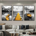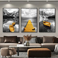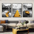 Enhance your home with the 3pcs Yellow Boat On The Lake Landscape Canvas Prints, a stunning set of abstract landscape paintings that bring tranquility and beauty into your space. This elegant artwork features a yellow boat on a serene lake, a golden wooden bridge, and majestic mountains in the background, all captured in soft, modern hues. Its calming and peaceful aesthetic makes it the perfect addition to any living room, bedroom, or office.